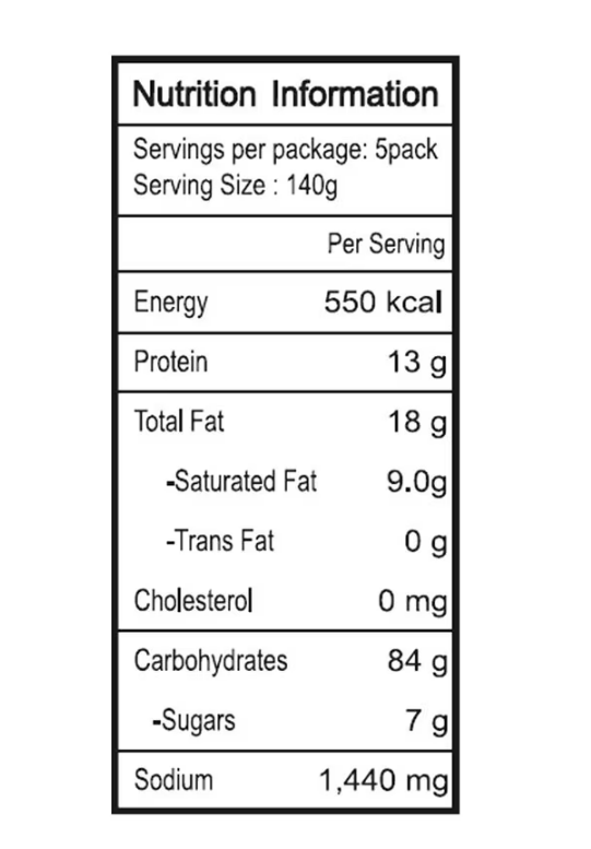 麵: 小麥粉, 改性木薯澱粉, 精製棕櫚油, 麩質, 精製鹽, 乳化劑, 酸度調節劑, 增稠劑, 綠茶調味油, 色素. 醬料: 水, 辣芝士醬, 醬油, 糖, 雞粉, 大豆油, 哈瓦那辣椒味粉, 洋蔥, 紅辣椒調味粉, 蒜, 肉汁調味粉, 改性澱粉,紅辣椒粉, 脫色辣椒萃取物, 紅椒萃取物, 黑胡椒粉, 咖哩調味粉. 芝士粉: 水牛芝士粉, 烤芝麻, 紫菜.