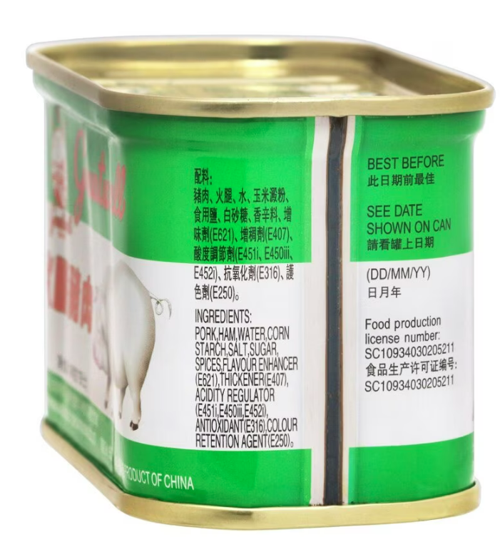 遠大貿易有限公司首創,香港罐頭的代表作、馳名港澳6載,品質優良、穩定,深入民心。火腿花和肉泥的完美比例,較其他午餐肉澱粉含量低。口感豐富、充滿質感。